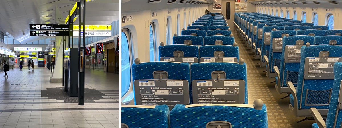 特に広島県は、原爆ドームもあり平和の象徴の街ですので、外国人旅行客の方も多かったのですが、新型コロナウイルスの影響に伴い全く見られなくなりました。広島駅構内とのぞみ24号(広島ー東京)3月の車内