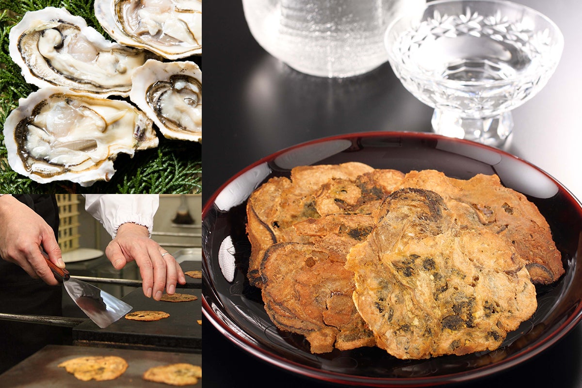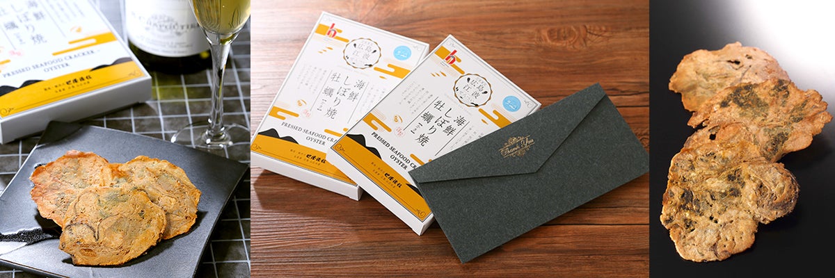 独自開発した「しぼり焼」の技術で、瀬戸内・広島の海産物をつなぎの小麦粉等、一切使わず、卓越した技術を持つ職人が、新鮮な素材をそのままの姿で一枚一枚手焼きする、唯一無二の味で濃厚な風味とバリバリとした食感が特徴です。