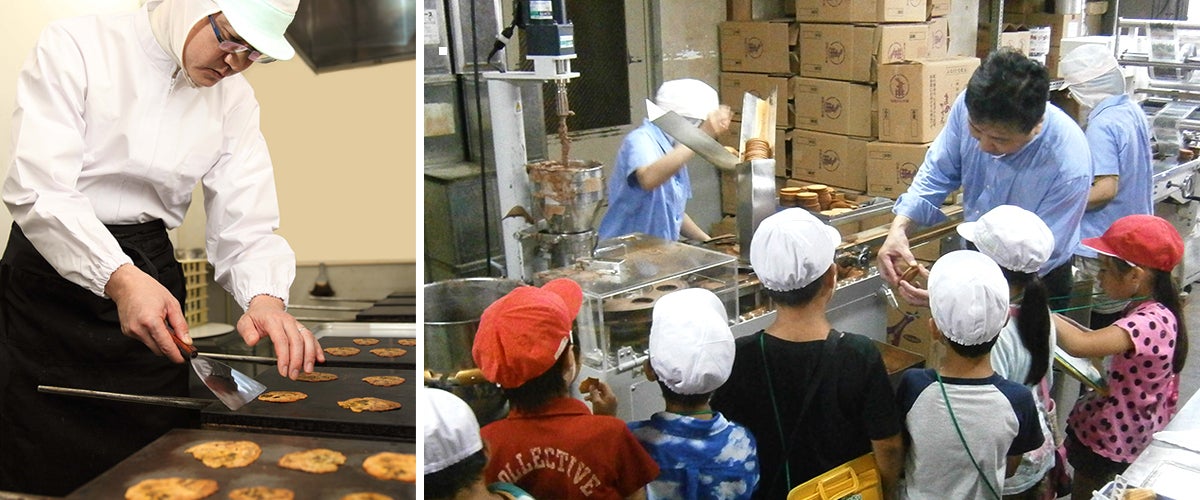 人気レポーターの井上さんと清信手焼き作業と地域小学校の工場見学宮島さんとその他の商品