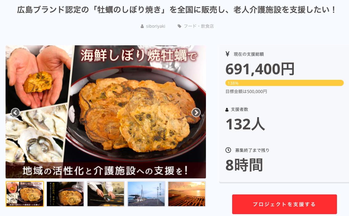 広島ブランド認定の「牡蠣のしぼり焼き」を全国に販売し、老人介護施設を支援したい!