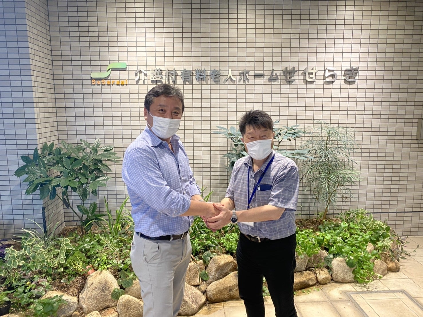 先日、共同起案プロジェクトの同志、介護付有料老人ホームせせらぎの施設長、重松様に今までの経緯、進捗状況を改めてご説明させていただきました。