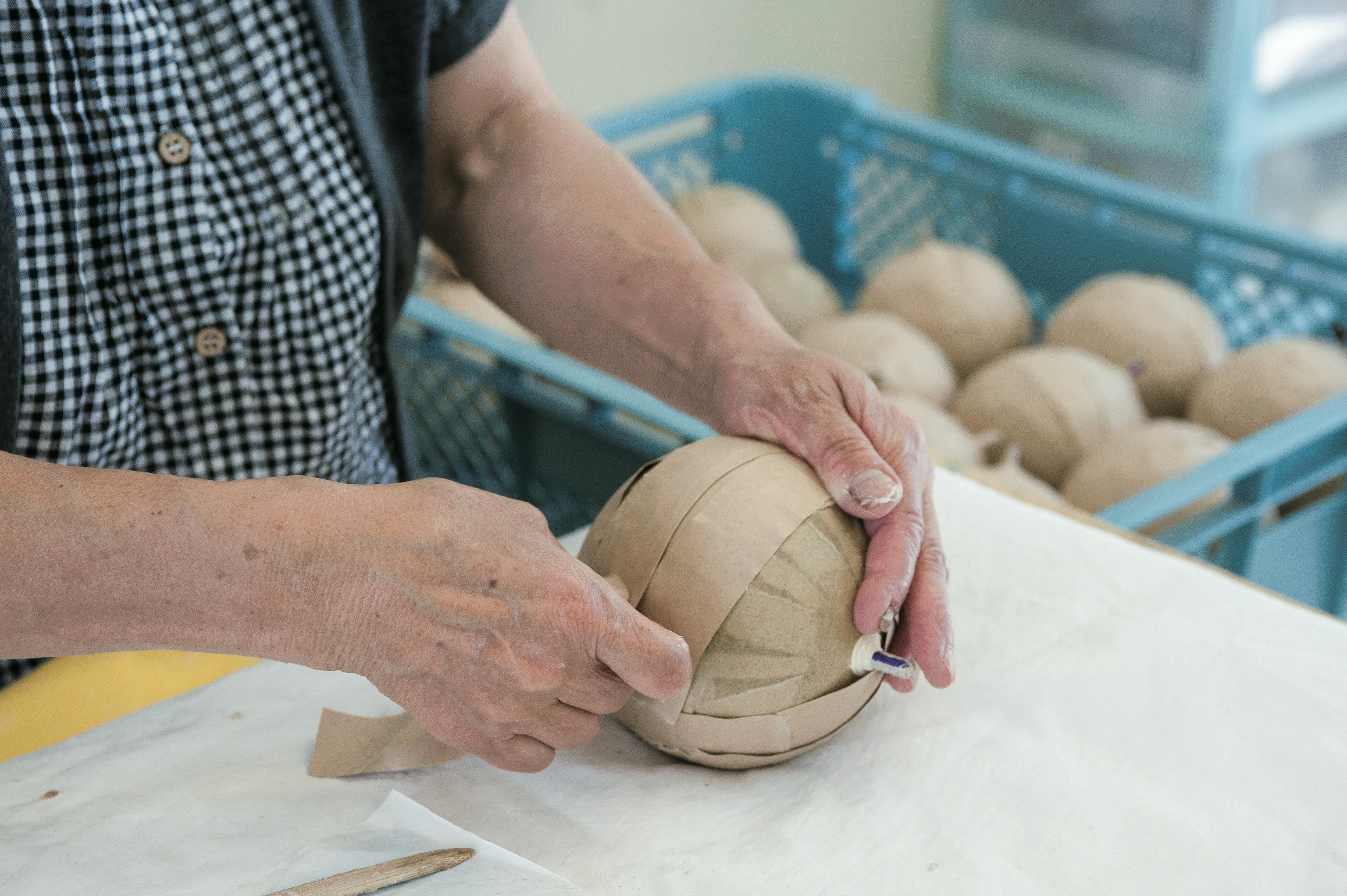 この「市川和紙」こそ「市川花火」の生産、発展には欠かせないものでした。和紙で出来た半球に火薬を詰め、二つ合わせた球に帯状に切った和紙を繰り返し重ねて貼っていく。花火の美しさは和紙の質と絶妙な重ね貼りによって決まります。