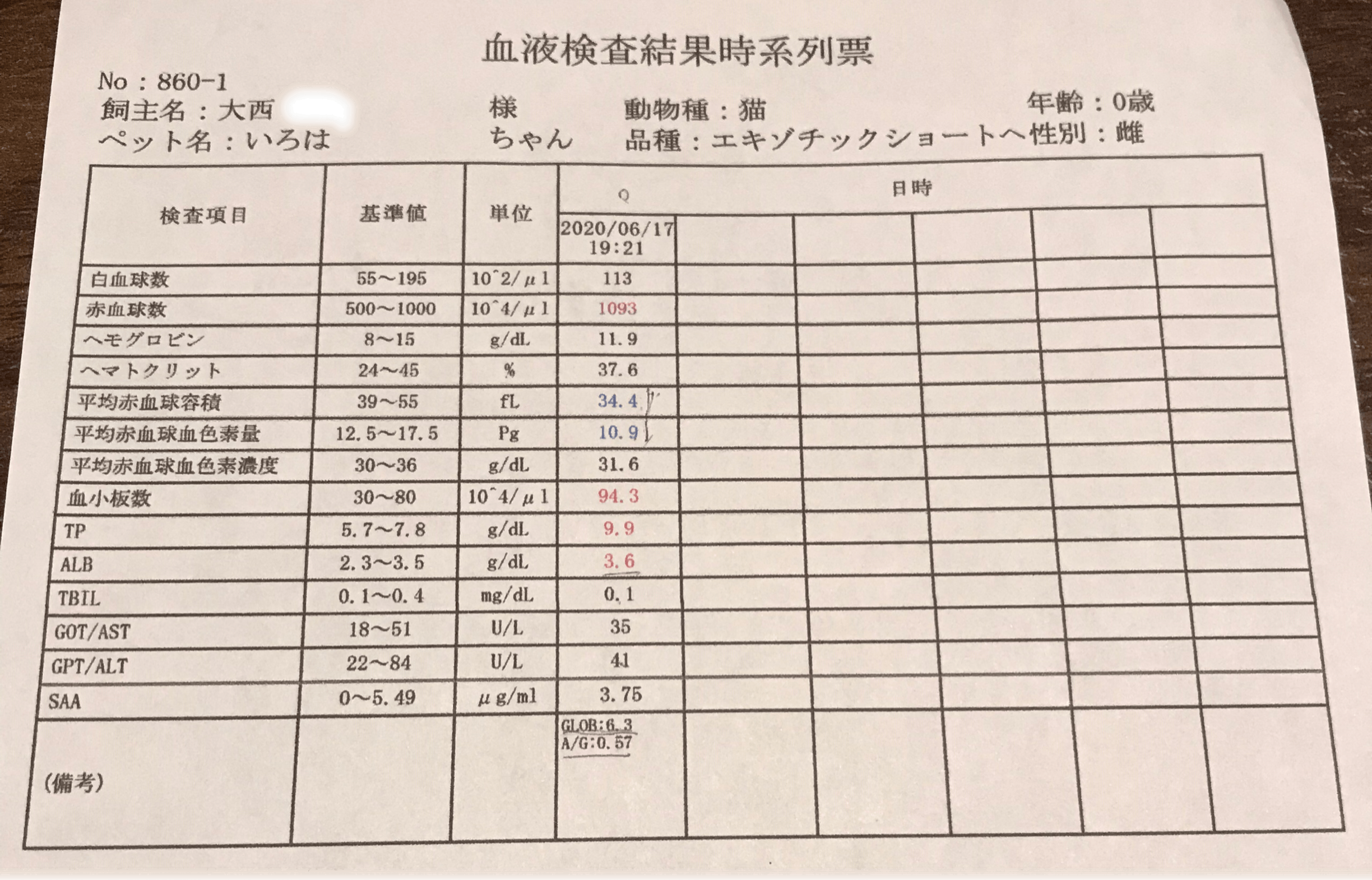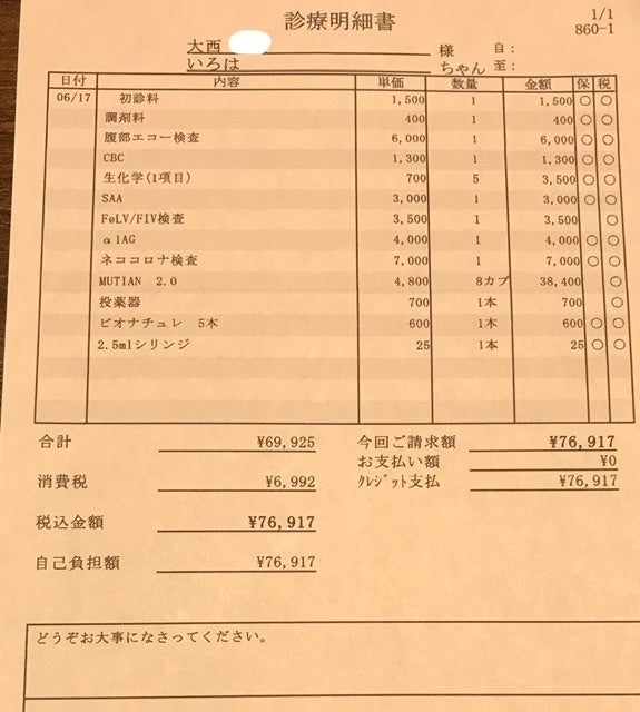 ●6月17日検体検査結果が出る前に、居てもたってもいられず、日本未認可のお薬でFIPを治療してくれる病院を予約しました。かかりつけ医へ向かい、紹介状とレントゲンのデータをいただきます。検体検査結果は、届き次第、連絡をいただけることになりました。新しい病院で問診票を記入している際に、検査結果の連絡がきましたが、残念なことに、やはり陽性でした。そのことを新しい病院の先生に伝え、診察開始です。1時間以上も、付きっきりで診察してくださいました。エコーの結果、一昨日胸水を抜いたばかりですが、やはり水が溜まってること。採血の結果、貧血が見られることを告げられました。一刻も早く治療を開始したい旨を伝え、本日分の日本未認可薬を投与していただきました。今後は私がいろはちゃんに毎日カプセルを投与します。とりあえず1週間分のお薬を処方していただき、帰路につきます。