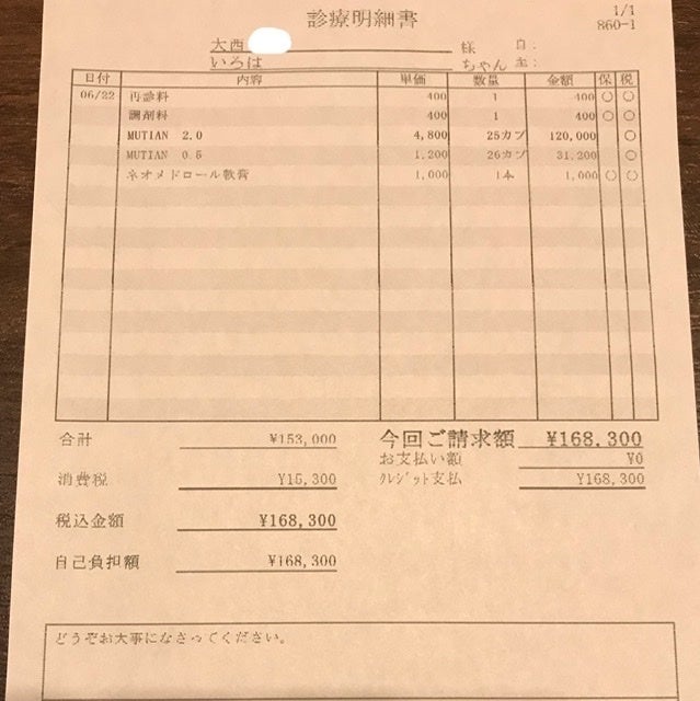 <新病院にて1回目通院時明細書>