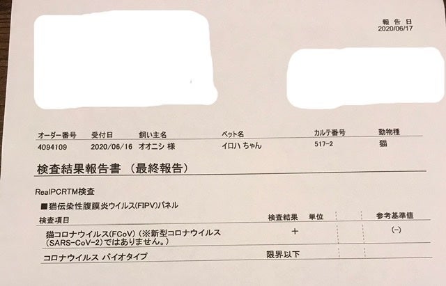 ●6月17日検体検査結果が出る前に、居てもたってもいられず、日本未認可のお薬でFIPを治療してくれる病院を予約しました。かかりつけ医へ向かい、紹介状とレントゲンのデータをいただきます。検体検査結果は、届き次第、連絡をいただけることになりました。新しい病院で問診票を記入している際に、検査結果の連絡がきましたが、残念なことに、やはり陽性でした。そのことを新しい病院の先生に伝え、診察開始です。1時間以上も、付きっきりで診察してくださいました。エコーの結果、一昨日胸水を抜いたばかりですが、やはり水が溜まってること。採血の結果、貧血が見られることを告げられました。一刻も早く治療を開始したい旨を伝え、本日分の日本未認可薬を投与していただきました。今後は私がいろはちゃんに毎日カプセルを投与します。とりあえず1週間分のお薬を処方していただき、帰路につきます。