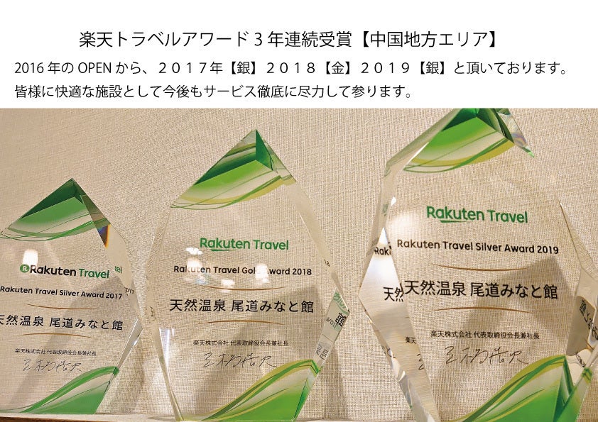 また、宿としてお客様の満足度、リピートしていただける価格設定など様々な商品企画を行っている事が評価され、宿泊予約サイトでも3年連続表彰して頂いており、スタッフ一同誇りを持たせていただきながら営業させて頂いております。