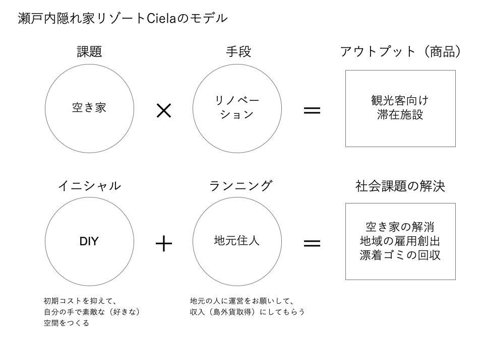 瀬戸内隠れ家リゾートは、地域の課題となる空き家をリノベーションする事で、観光客向けの滞在施設にした上で、施設の運営を地元の人に委託し、空き家の解消、地域住人の島外貨取得、地域の漂着ゴミの回収など、様々な社会課題の解決を行なうモデルとなっています。