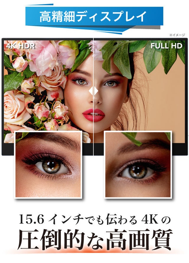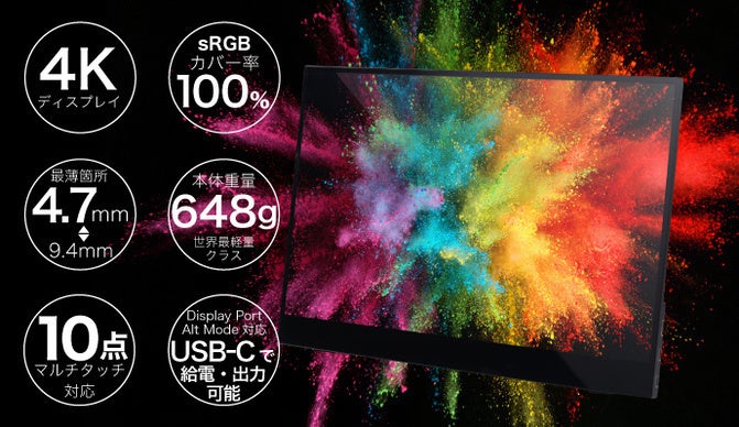 本体の重量は648gと超軽量です。こんなに薄くて軽いモニタなのに4Kの超高精細映像を映し出してくれます。今までに味わったことのない未知の体験をご自身の手でご体感ください。