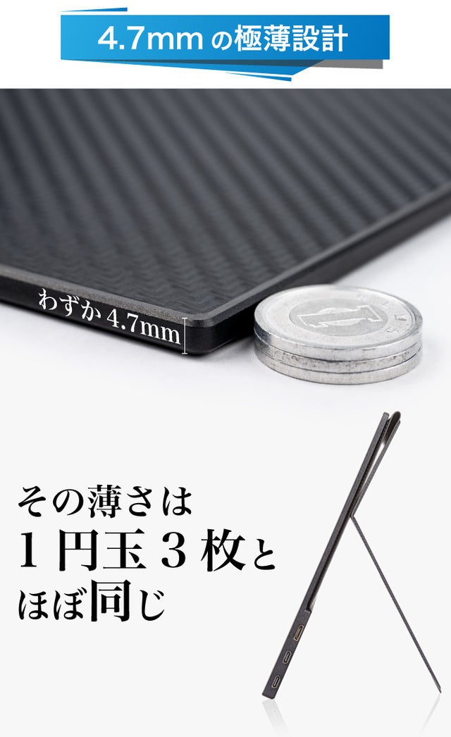 本体の薄い部分は4.7mmと世界最薄クラス。その薄さは1円玉を3枚重ねたのとほぼ同じ薄さです。