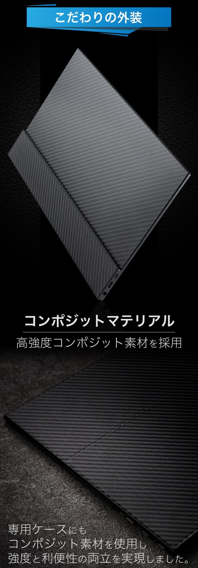 軽くて高強度のコンポジット素材(複合素材)を本体背面と付属のマグネット着脱式専用スタンドケースに採用しました。