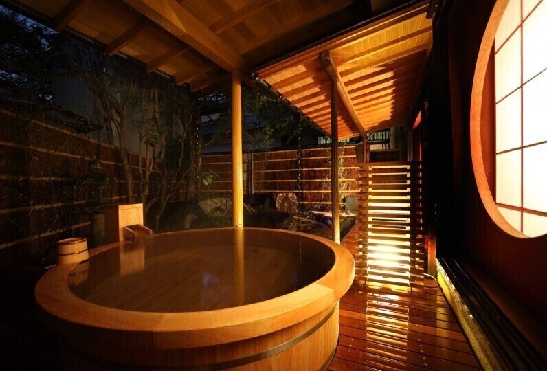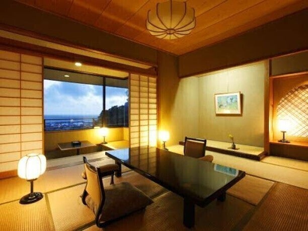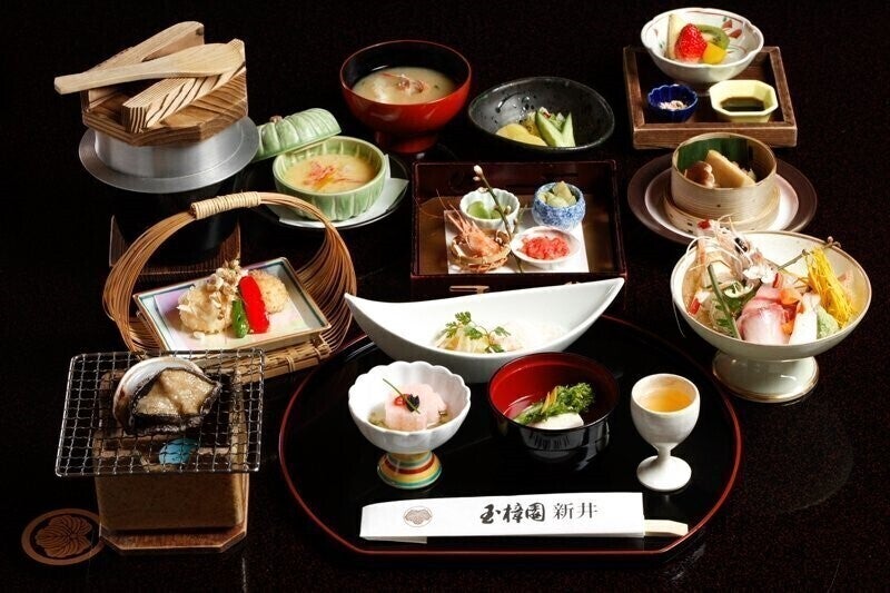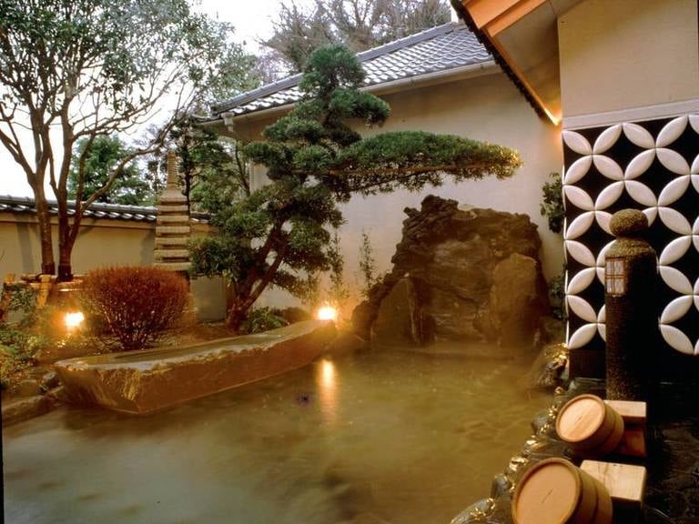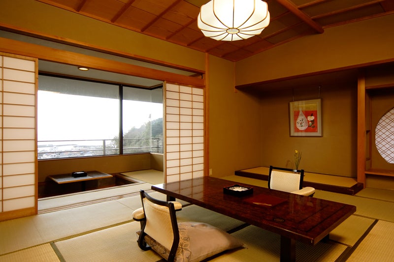 西伊豆 土肥温泉「玉樟園新井」は、源泉から毎分110リットル以上の温泉が給湯され露天風呂からあふれています。名物のうちわ海老をはじめ、海の幸の懐石料理は旬の味を堪能できます。町の中心からも海岸からも近い閑静な日本の宿です。四季花咲く庭園の中に建物が離れ形式に配置され渡り廊下でつながっています。高台に建つ詩季亭から町並みの甍越しに駿河湾を一望できます。