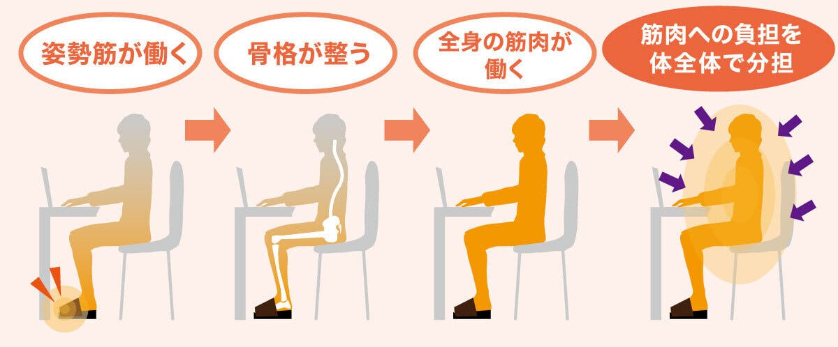 私たちはこの問題に対し身体の機能を座りながら発揮できるポイントはどこか?を追求しました。そして導き出した答えが足指を働かせ姿勢を安定させることでした。