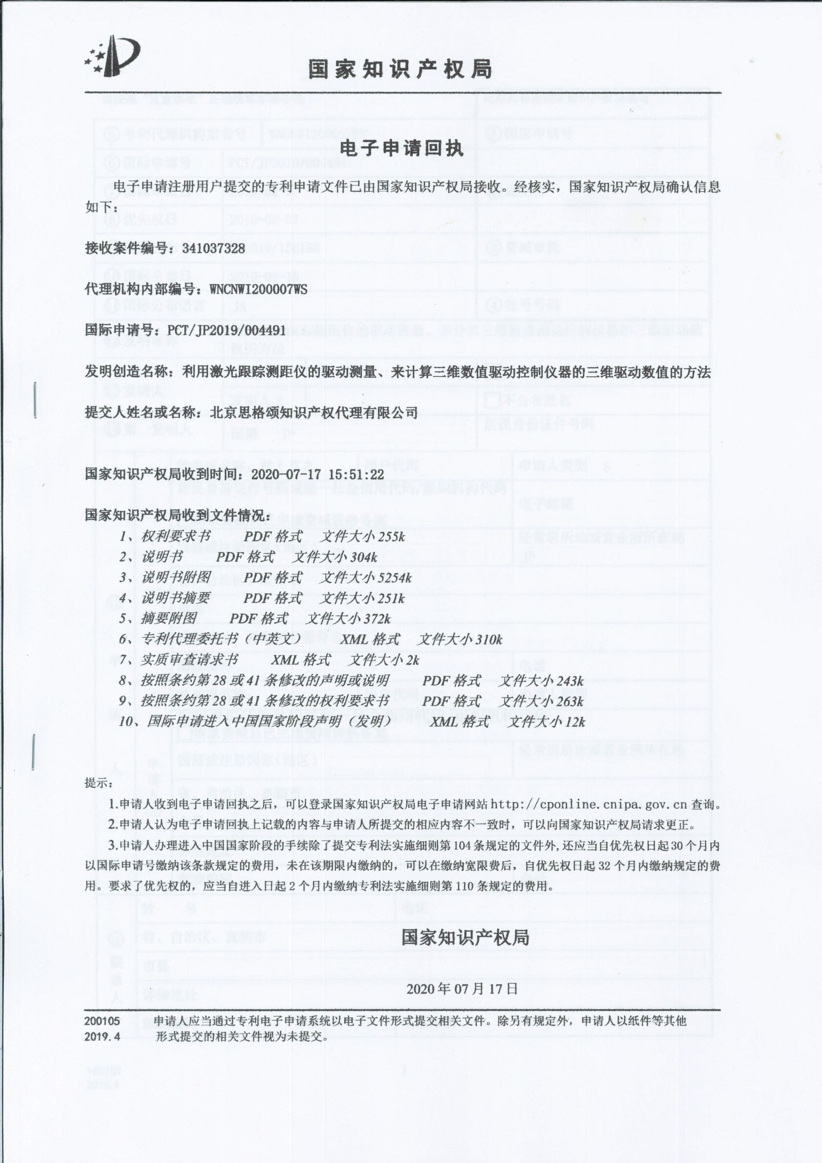 現地代理人に依頼し、2020年7月17日に、中国への移行出願した中国電子出願の受領シート。