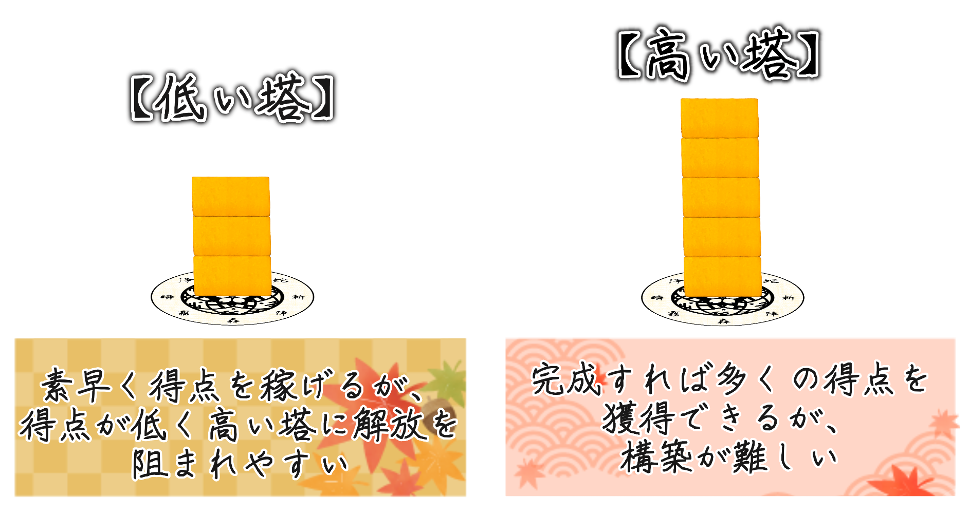 駒の種類を揃えたり、高く積み上げる事によって、さらに高得点が狙えます!!