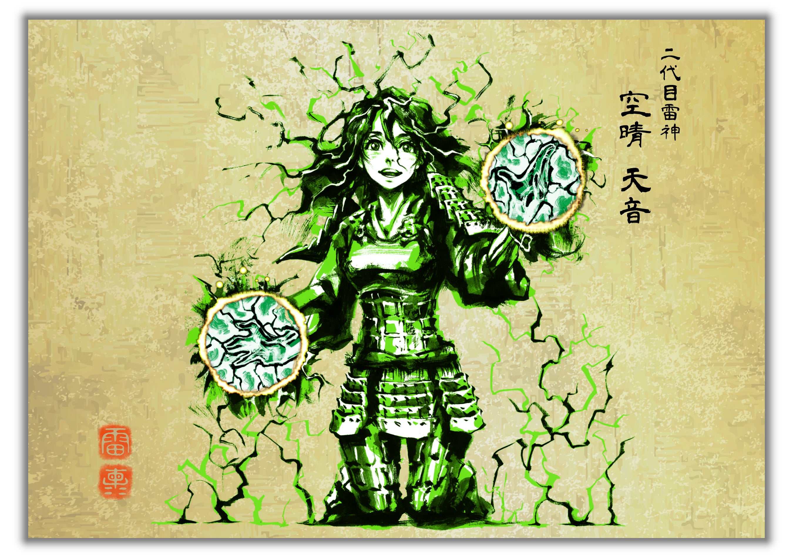 お待たせいたしました!岩元辰郎さん描き下ろしの雷轟プレイマット新キャラクター二代目雷神『空晴天音』を公開いたします!!深山幽谷の風薫る、深緑の雷を司りし者愛くるしいその表情が素敵!キャラクターストーリーは準備が出来次第公開いたします!今回の雷轟新キャラクターはこれで出揃いました!!早く製品版をプレイしたいです(*´ω`*)