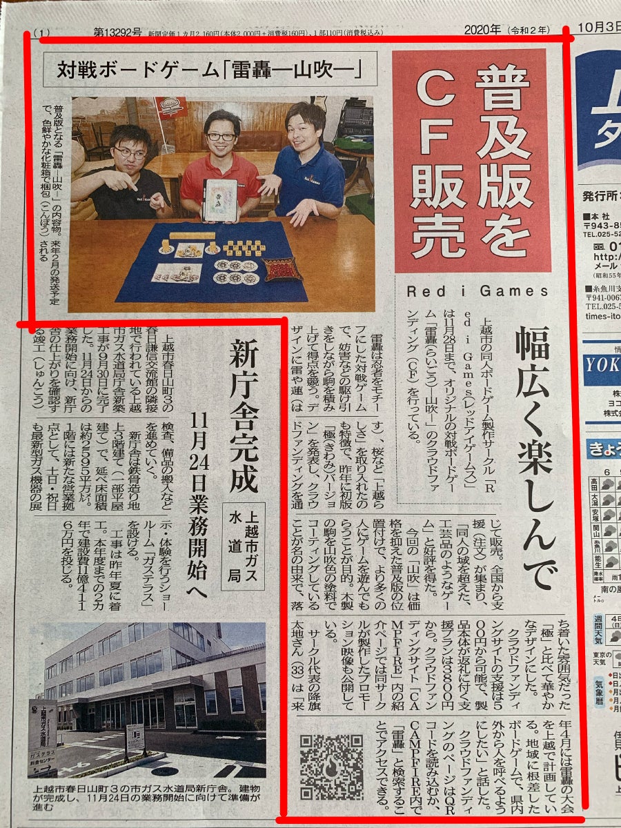 お世話になっております。Red ℹ︎ Gamesのあかめです。本日10/3(土)に、上越タイムスさんに『ボードゲーム“雷轟”普及プロジェクト』のクラウドファンディングを取り上げていただきました!【雷轟】の面白さを…もっともっと沢山の人に知っていただけるようにこれからも活動を頑張っていきます!応援よろしくお願いします。雷轟!始めるなら今ですよ〜!!wまた、近日中に新しいお知らせが出来ると思います。お楽しみに!!