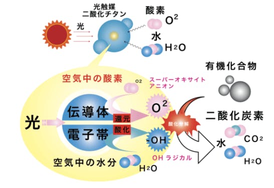二酸化チタンの表面に光エネルギーが当たると、空気中の水分と酸素が反応し、