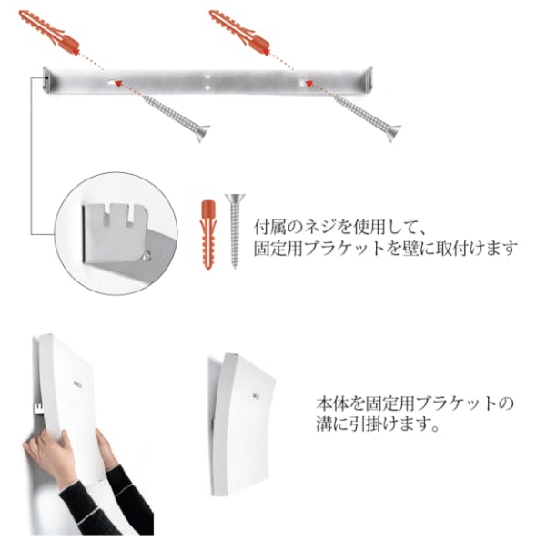 2本のネジで簡単に壁に取り付ける事ができ、3.5Kgと軽量なので女性でも簡単に