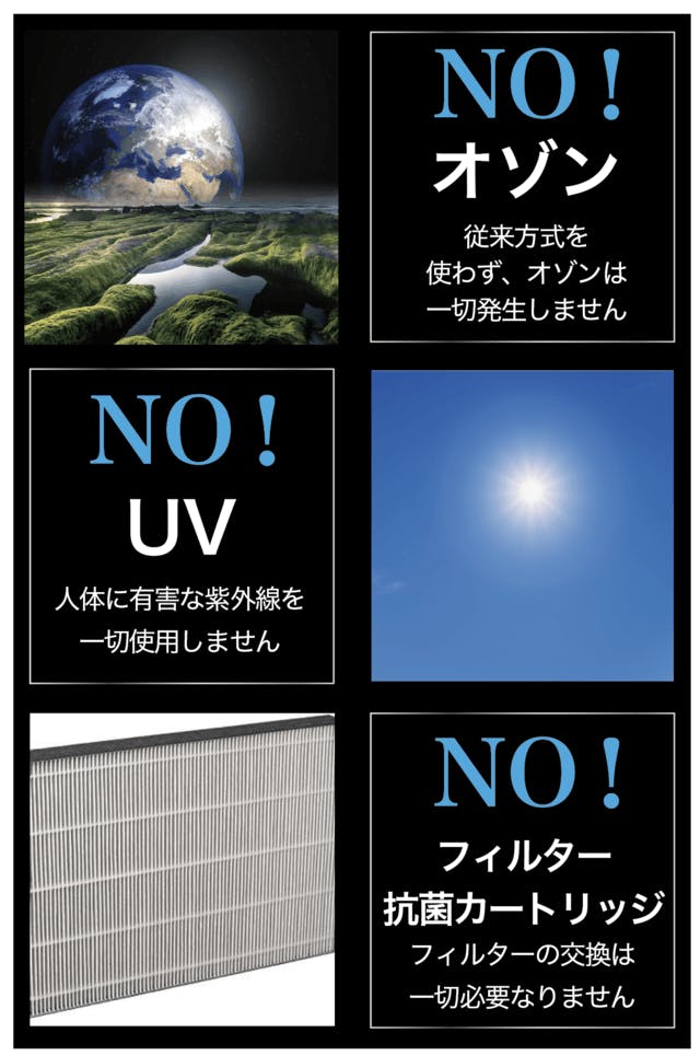 まったく発生・使用することなく安全に空気清浄と除菌・脱臭をする事ができます。