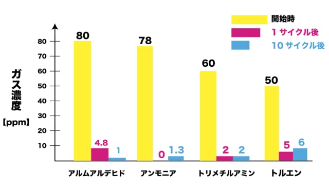10サイクル繰り返し使用しても脱臭機能の低下ほぼなし。
