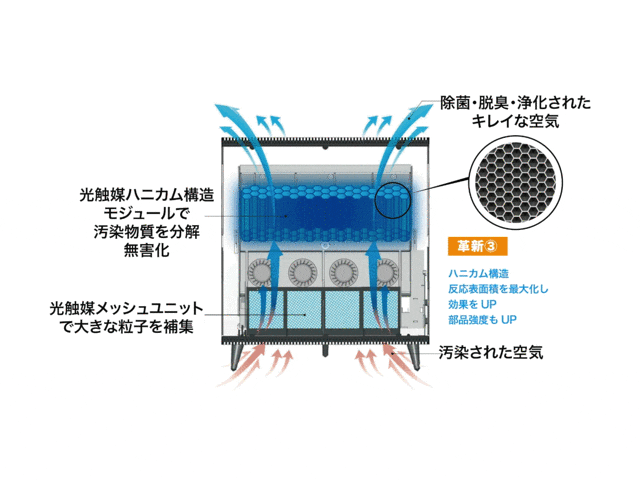 内部ハニカムモジュールは光触媒反応を起こすことで自己浄化作用があり