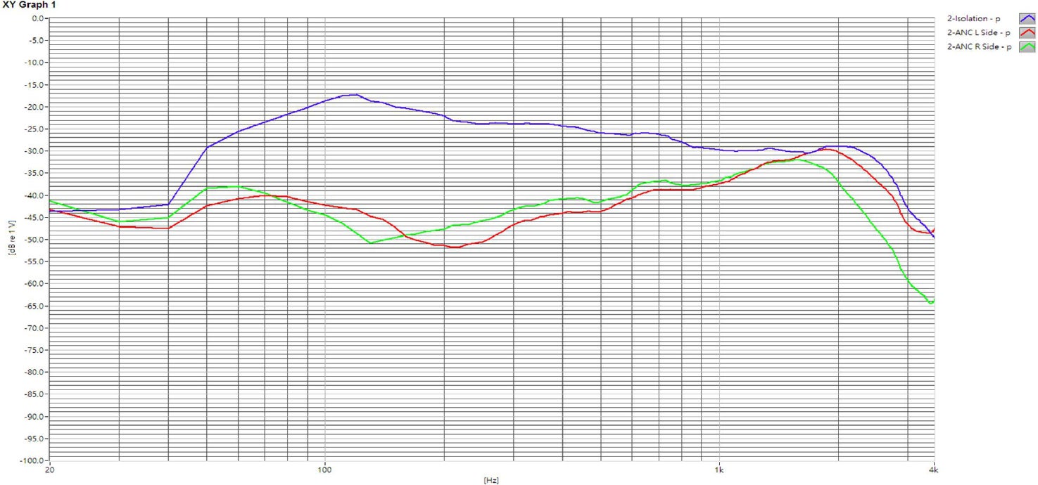 Isolation(遮音)[青色]と、ANC(左[赤色]と右[緑色])の対ノイズ性能を示すグラフ