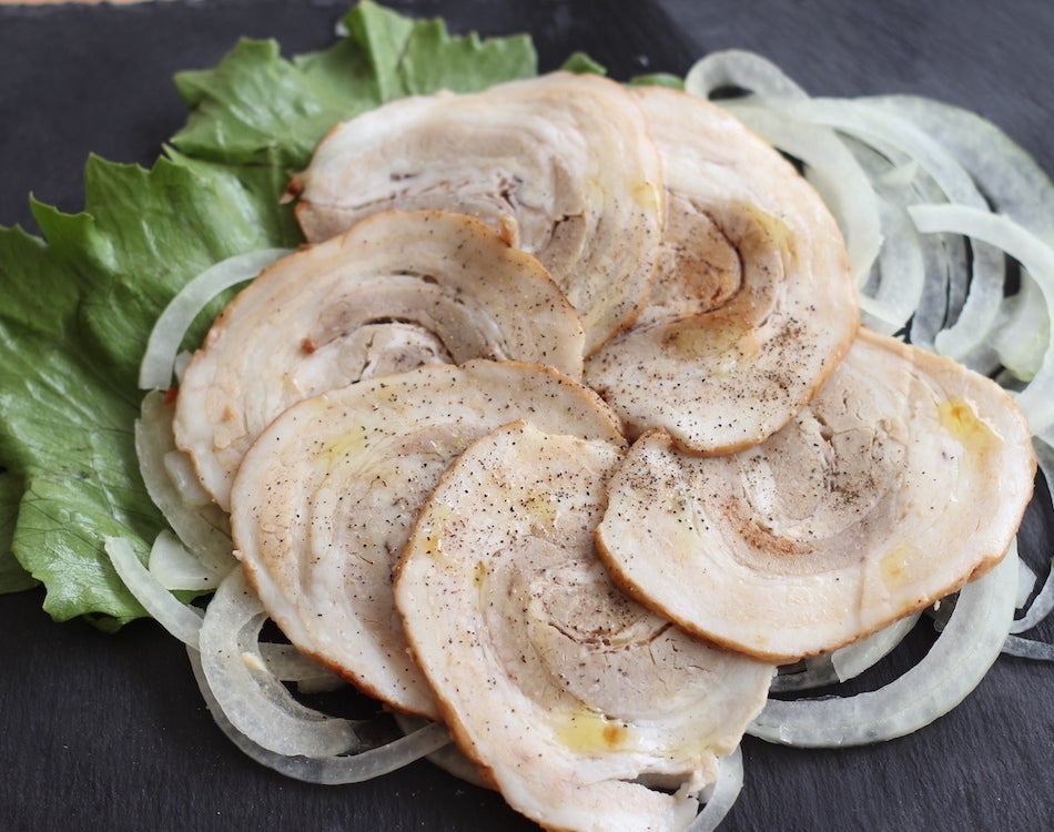 当店では、このノンメタポークを当店独自の製法で加工し、旨味を逃さず、ジューシーで柔らかいチャーシューに仕上げております。とろける食感やヘルシーさがお客様に好評で、特に高齢の方でも食べやすい肉として人気があります。