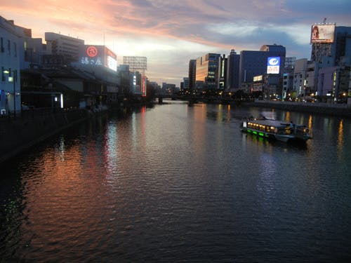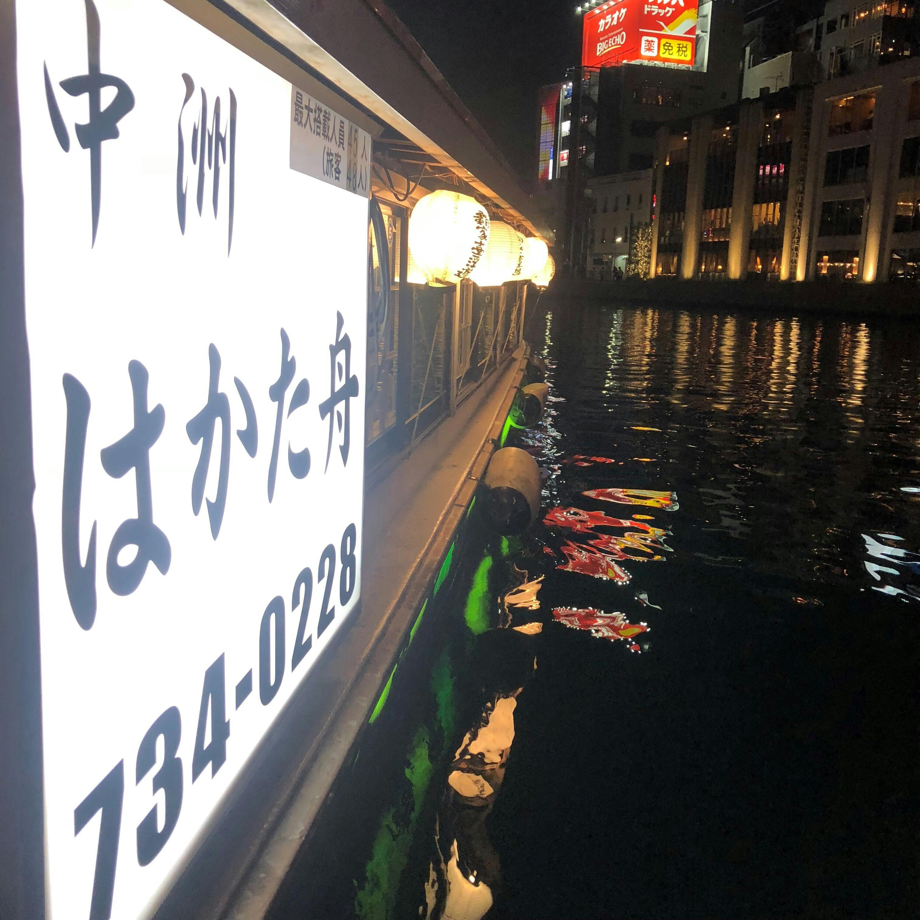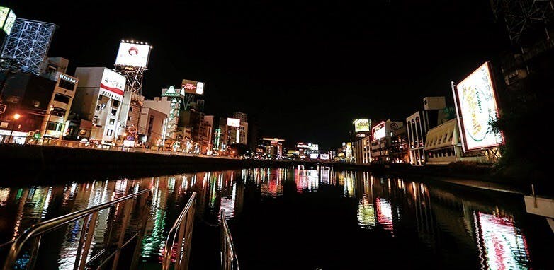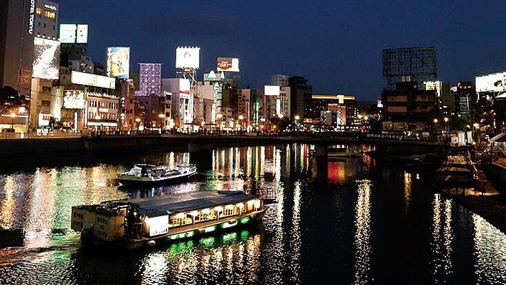 お食事に舌鼓を打ちながら、屋形舟でしか味わえない中洲のネオン輝く夜景を