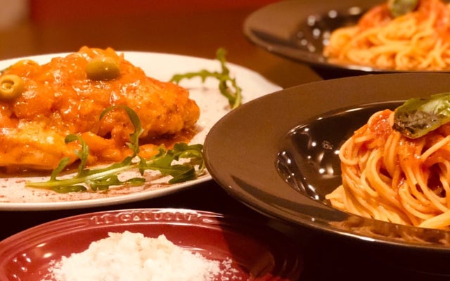 鶏肉のカチャトラ、パスタソース、特製塩