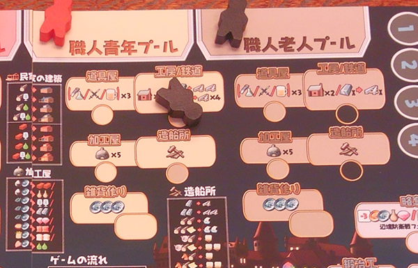 「一人のワーカー(コマ)で木を切ってきて、別のワーカーでその木を使って家を建てる」、のように進めていくゲームです。