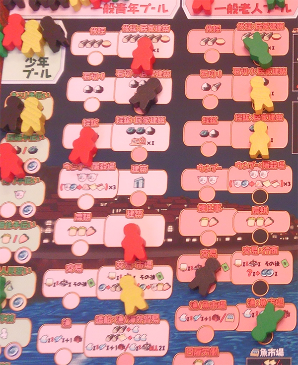 多彩なアクションの中から、実行したいアクションに自分のコマを派遣することで結果を受け取ります。