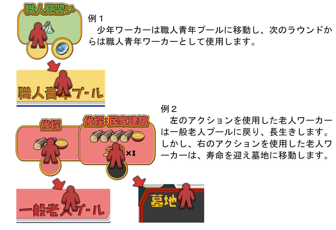 しかし、老化が進みすぎたり死者が多すぎたりすると、ワーカーが減って思うようなアクションができなくなり衰退を招きます。