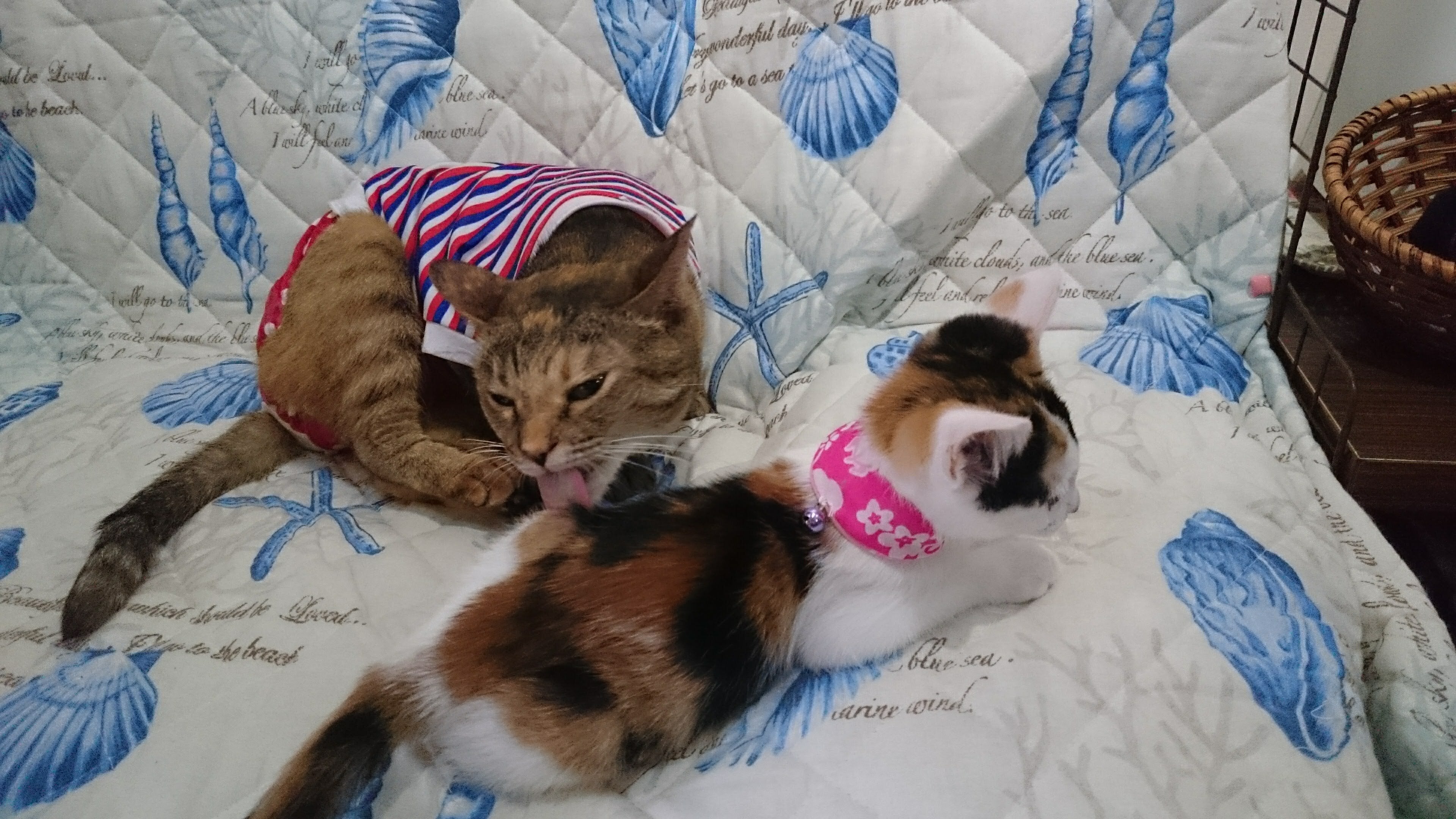 うちには、いつも服を着てる子がいます♪(2年前までは5年間オムツもつけてました)名前は【えんちゃん】彼女は鼻が潰れ片眼が見えなく耳も聴こえてませんそんな、えんちゃんのストーリー…7年前…母と妹が実家に帰る途中…甥っ子らしき子が見えたので、声をかけようと…普段はあまり通らない田舎道を車で走っておりましたあれ?甥っ子じゃなかったんかな?っと話してたら、車道の真ん中に…車にひかれ、目から耳から口から鼻からあらゆる所から出血して死にかけてる仔猫を発見!ほってはおけない!!!っと保護し、すぐ病院へ…先生は彼女を見たとたん…『あぁぁ…この子は、たぶん、もう何しても助からへんと思う…木原さん所は、いっぱい猫おるから、虫下し(ノミダニお腹の虫を殺すスポット)だけしておこうか…』っと寂しそうな声でおっしゃいました。先生はいつも親身になって、みんにゃを助けて下さってて、その先生がそうおっしゃるなら仕方ない…っとスポットだけ落として貰い家に連れて帰りましたが…母は最後まで諦めません!身体を温めシリンジ(針のついてない注射器)で水を飲まし、高栄養の流動食を飲ませ、頭が定まらなくずっと揺れてるので、いつも抱っこし彼女を看病してました…(母は当時看護師でした(今は引退しカフェで娘に使われております(笑))いつも震え、母が目をはなすとニャーニャー大きな声で鳴き…オシッコウンチも垂れ流し…頭を強打し神経がおかしいのか、いつもブルブル震えるので服を着せオムツを履かせてましたいつどうなるのか解らない…でもこの子は一生懸命生きてる…看病の毎日が続きました…すると…なんと言う事でしょう!!!だんだん元気になっていき、うろうろ出来る様になりました!!!でも…頭を強打しててオシッコウンチ(トイレ)が決まらなく、いつも粗相をし、人の姿が見えないと大きな声で鳴き叫ぶ…片眼が見えなく頭を強打してるのでずっと首が揺れゴンゴンゴンゴン色んな所にぶつかり…(危ないのでしばらくはハーネスもつけてました)鼻が砕けてるのでくしゃみをすると血鼻が飛び散り家中、彼女の血鼻まみれになってました…なぜこの子は鳴き叫ぶのか母は理解出来なかったんですが、私が様子を観察してると、ん???この子、耳が聴こえてないんちゃうか?っと思い、色々試した所、やはり耳が聴こえてませんでした。片眼に膜がはり目が見えなく耳も聴こえなく鼻が潰れてるので血鼻を飛ばす彼女…名前をどうするか…保護した日は偶然にも妹の誕生日で甥っ子を追い、入った道で見つけたので…【縁があった子】で【えんちゃん】と名づけられました。えんちゃんが助かり、その半年後に発情が来たので、先生の所に避妊手術に連れて行くと…先生『えっ!この子生きとったん?!』っとビックリビックリ!!!感動の再会となりました(笑)それから5年間、毎日毎日オムツ交換下痢をするとお尻を洗い、血鼻を撒き散らすので、割りと大変なえんちゃんでした(笑)それが…2年前、仔猫達がトイレに行ってるのを見てた、えんちゃん…これ又、なんと言う事でしょう!!!トイレに入って嬉しそうに砂をかいてるではありませんかぁ~!!!すぐ飛んでいき、オムツを外すと、初めてトイレでウンコができたのです!!!それから、オシッコウンチがしたくなると、嬉しそうにトイレの砂をかきかき…たまに失敗してましたが、もう今では一切失敗する事なくキチンとトイレで出来る様になり、オムツは卒業しました♪血鼻は治りましたが、今でも寝起きはグシュン!!!っと盛大に鼻を撒き散らす、えんちゃん(笑)お客様にぶっかける事も多々ありますが…なんと言う事でしょう…お客様は良いよ良いよ♪っと許して下さいます(涙)(なんて優しいお客様がた…感謝感謝)寂しがりやで人間大好き暖かい所も大好きなので、いつも、お客様の膝にちょこんと乗せて貰ってます♪縁があって来た【えんちゃん】来年4月で家に来て8歳これからも元気に長生きして、お客様の膝を暖めてあげてね~♪Photo すみれが来た時、えんちゃんがお世話してた時の一枚です♪