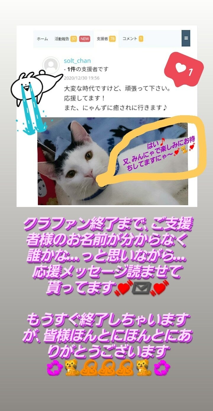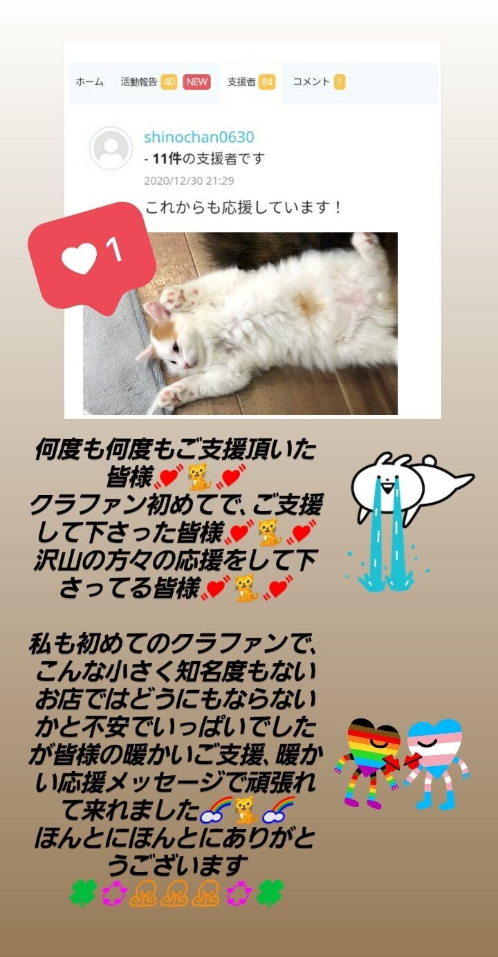 クラファン終了までご支援者様のお名前が分かりませんが、暖かい応援ご支援メッセージで頑張れてます!!!