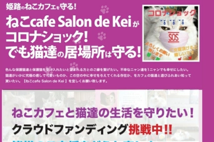 コロナ禍でボロボロの【ねこcafe Salon de Kei】が存続が出来る様に厚かましいお願いですが、皆様にご支援頂きたくクラウドファンディングにエントリーさせて頂きました。