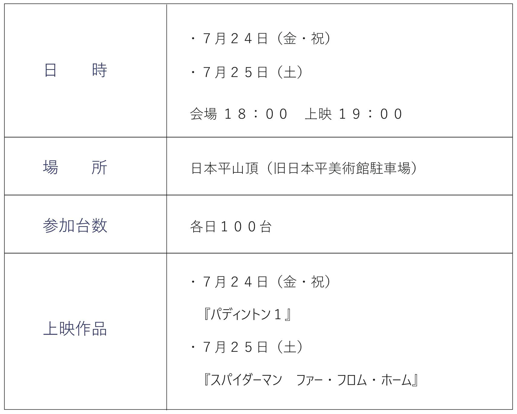 •車輌のご入場は各日18:00開始となります。18:50迄となります。上映開始後のお車の移動は出来ませんのでご注意下さい。