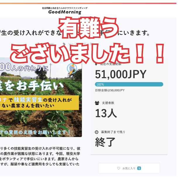 2020/07/17 03:02先ほど皆様のご協力で目標50,000円を超え、51,000円ものご寄付とともにクラウドファンディングプロジェクトを終了させていただくことが叶いました。本当に有難うございました。皆様からお預かりしたお金は次回以降の活動の費用として使わせていただきます。今後の予定としましては、7/25,26で再度アクト農場様にお邪魔させていただきます。また、8月は大学の授業もないので平日にまたお手伝いをさせていただこうと考えております。首都圏でまた新型コロナウイルス流行の兆候が見え始め、我々メンバーも農家の方々(もちろん周りの方々)のご迷惑にならないようにしっかりと体調管理をしていきます。皆様へのリターンは8月以降順次発送させていただきます。お待ちしていただくことになり申し訳ありません。楽しみにしていてください!!この夏で皆様に成長した姿をお見せできるように頑張ります。この度は本当に有難うございました。ぜひInstagramのチェックもよろしくお願い致します。駒木 もっと見る