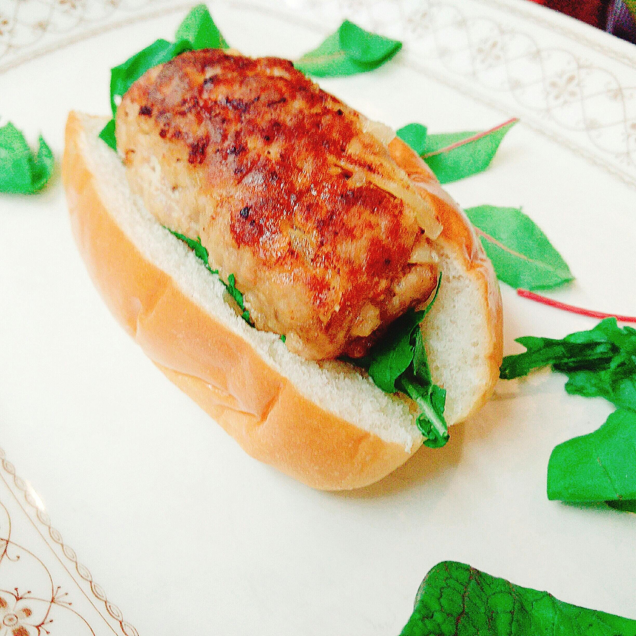 まずはホットドックのウインナーをハンバーグにしたらって商品見たことないので作りました。よそさんで概出だったらごめんなさい。