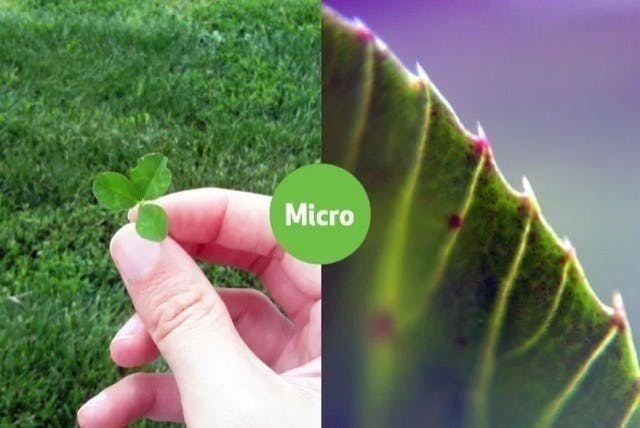 Micro(マイクロ)レンズは、約1/300mmの物体を識別ことが可能で、細胞や微生物を観察することができます。厚みわずか1.2mmのMicroレンズを装着するだけで、スマートフォンが高倍率の顕微鏡に早変わりします。高精細で観察するためには、対象物とレンズは6mmまで近づける必要があります。さらにデジタルズームを使えば、100倍以上の倍率を得ることも可能です。