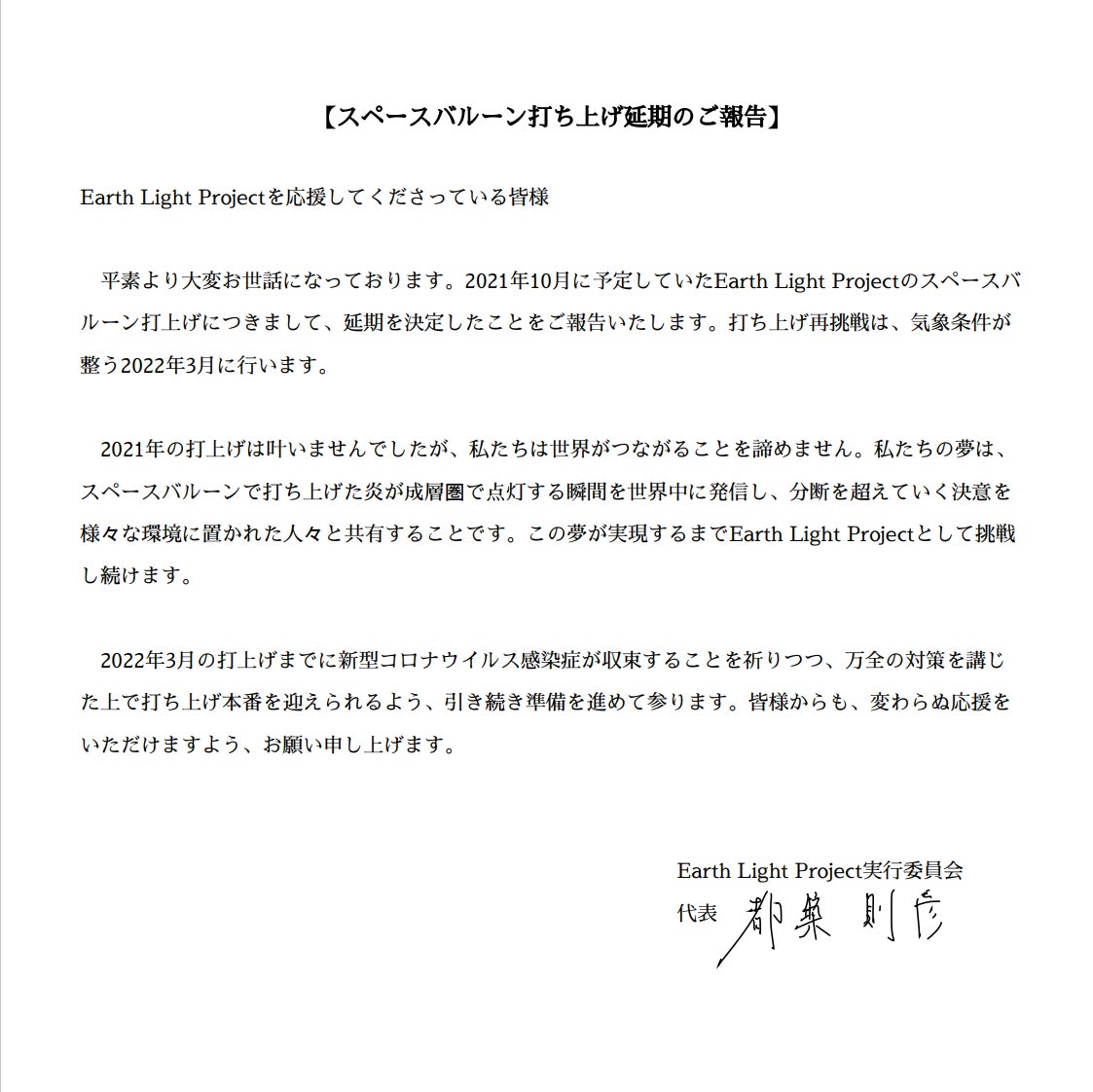 【Earth Light Project実行委員会 解散のご報告】大変ご無沙汰しております。昨年の8月に、Earth Light Project実行委員会を解散いたしました。大学生中心であったメンバーの多くも卒業をするこの3月のタイミングで、解散の理由と今後の動きについて、文面でまとめました。しかし、分断を乗り越えることが、ELPが掲げてきたビジョンです。さらにさかのぼれば、このプロジェクトは、無くなってしまった「国境を越えて走るオリンピック聖火」を宇宙を通して新しい形で表現することを目指してきました。そこで、ELPの有志メンバーが、ローターアクトクラブ・ロータリークラブと連携し、「炎越しの地球の映像」を「オリンピック難民選手団応援PV」に使用する企画を立ち上げました。このPVを完成させるための国際会議を開催するために、今日からパリに行きます!こうした情報は、引き続きEarth Light ProjectのX、Instagramより配信いたしますので、ぜひご注目ください。これまで応援いただいたみなさま、本当にありがとうございました。これからもメンバーの活躍を応援いただきますよう、よろしくお願いいたします。2025年3月4日 Earth Light Project実行委員会代表 都築則彦