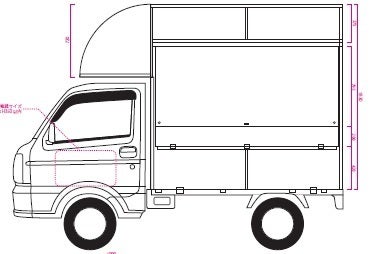 {詳細:ボックス内(床・壁・天井・コンセント設置・収納)、給排水シンク・タンク、外部電源入力口、提供窓(横・後ろ)、販売カウンター、提供カウンター}