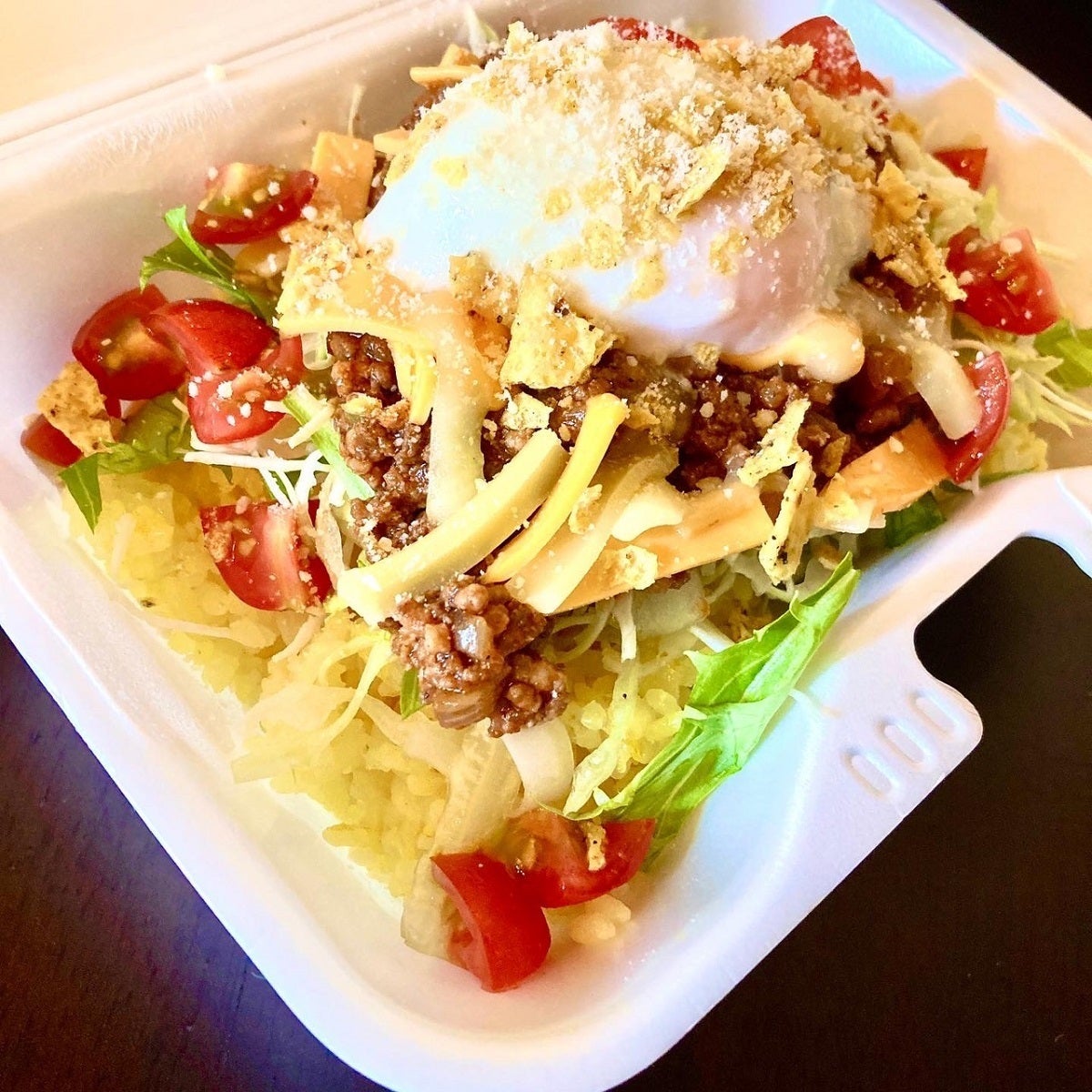 色々試作した結果、味の調和と彩り、黄色の明るいイメージが私たちのタコライスにはぴったりだと思いました!