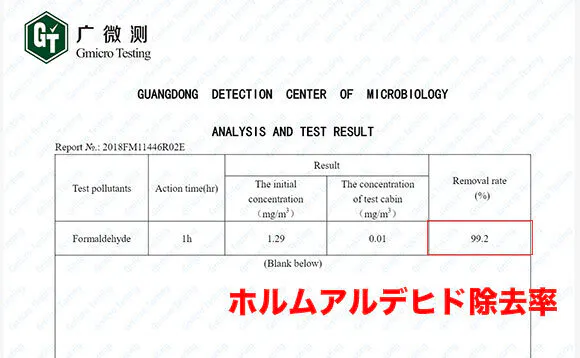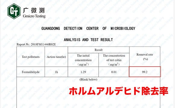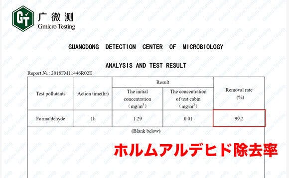 さらにマイナスイオンの力で、ホルムアルデヒドは 99.2%除去できます。