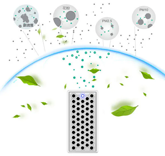 A:発生するマイナスイオンの力で、空気中の煙、ホルムアルデヒド、異臭を分解します。 また、花粉、アレルゲン、PM2.5の粒子に吸着、地面に落とす効果が有ります。