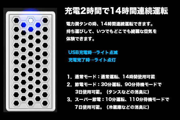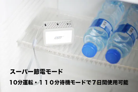 3.10分運転、 110分待機モードで7日使用可能。(冷蔵庫中での除菌・消臭に使う)