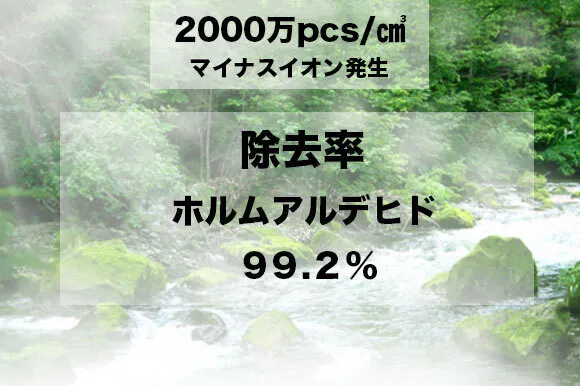 - マイナスイオン発生量は2000万pcs/㎤で,なんと自然の滝の1,000倍以上です。ホルムアルデヒドは 99.2%除去します。