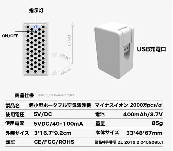A:超小型USB充電式タイプの空気清浄機になります。マイナスイオンを発生し、私たちの周りの空気をキレイにしてくれる製品です。