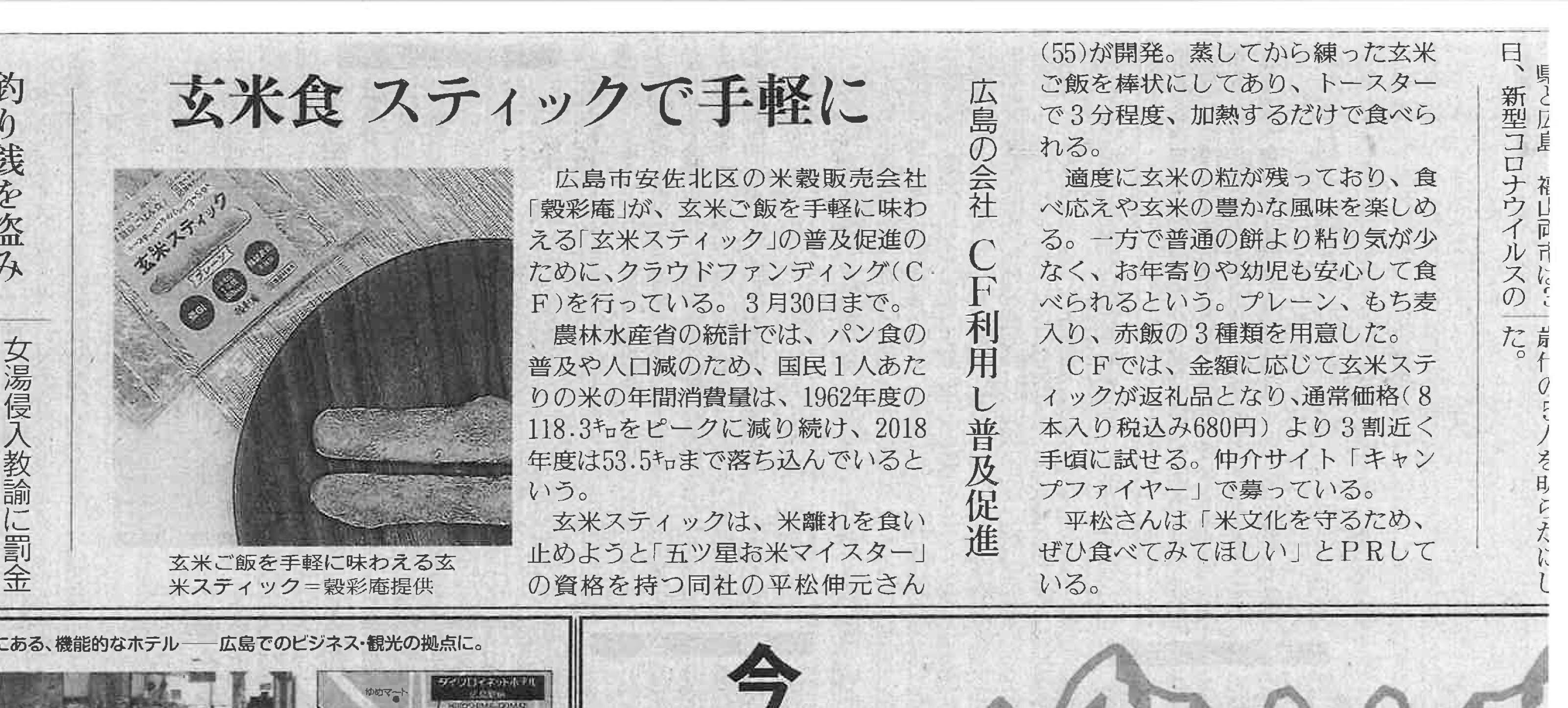 「米消費 新たな一手」として「玄米スティック」を紹介いただきました。米消費拡大をテーマとした記事を担当している方から連絡いただき、何度もとても熱心に取材していただきました。なんと、ご支援もしていただいたとのこと! 本当にありがとうございます。米消費拡大の一助となるよう頑張ります。