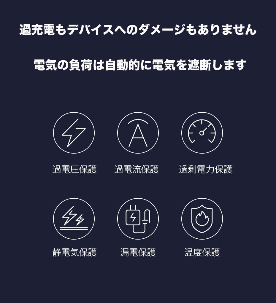 多重保護機能:過充電保護、過電力防止、過圧防止、過熱防止、静電気防止、ショート防止の充電保護システムを備えています。