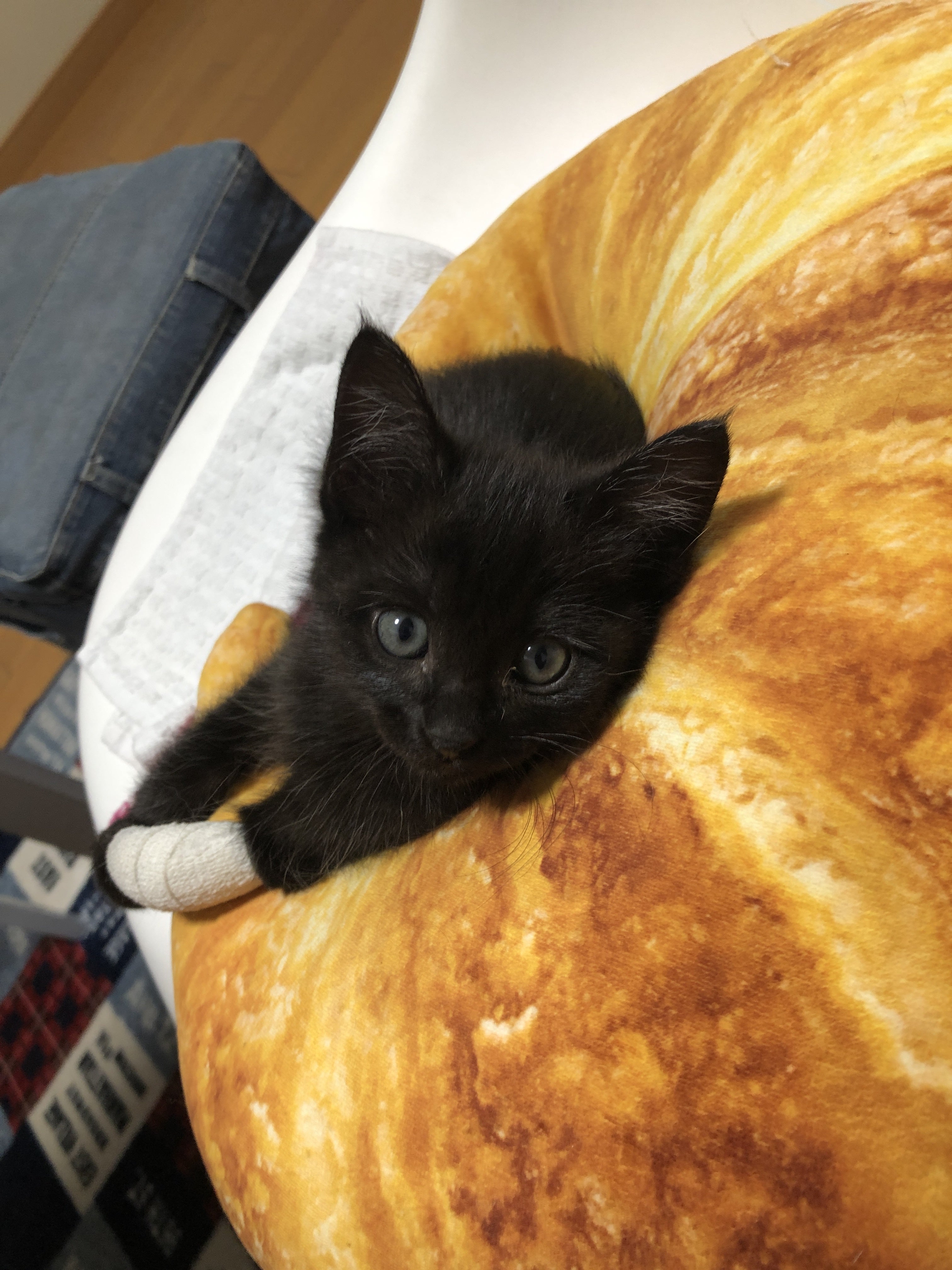 もともと私の叔母がボランティアで動物の保護活動をしており、実家でも保護猫を4匹、保護犬を1匹飼っており興味関心があったのですが、一ヶ月ほど前に仕事で京都から大阪へ車で向かっている途中、3車線もある大きな道路に子猫が飛び出してきました。間一髪で避けることができなんとか保護することはできました。ただ、左前足の靭帯が伸びておりギブスは取れましたが手首だけがまだ動かすことができない状態です。子猫自身は元気に走り回っていますが現在経過観察中です。